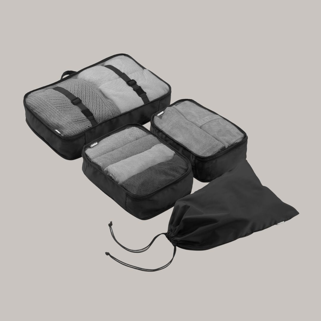 - 4-Piece Packing Cube Set – Includes cubes in multiple sizes plus a shoe bag/laundry pouch, designed to keep your Foldie organized and light.